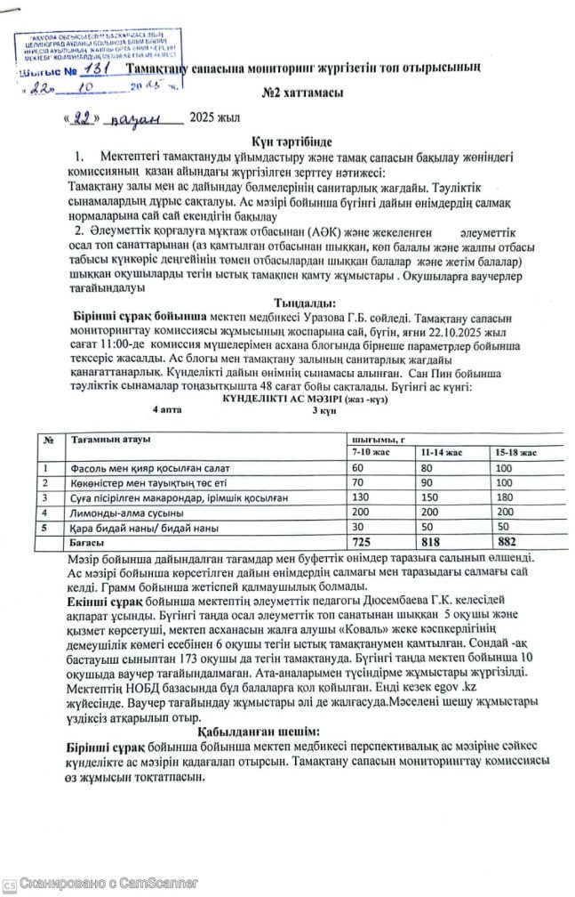 Тамақтану сапасын мониторингтау комиссиясының қазан айындағы хаттамасы