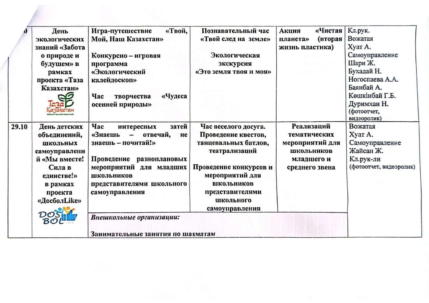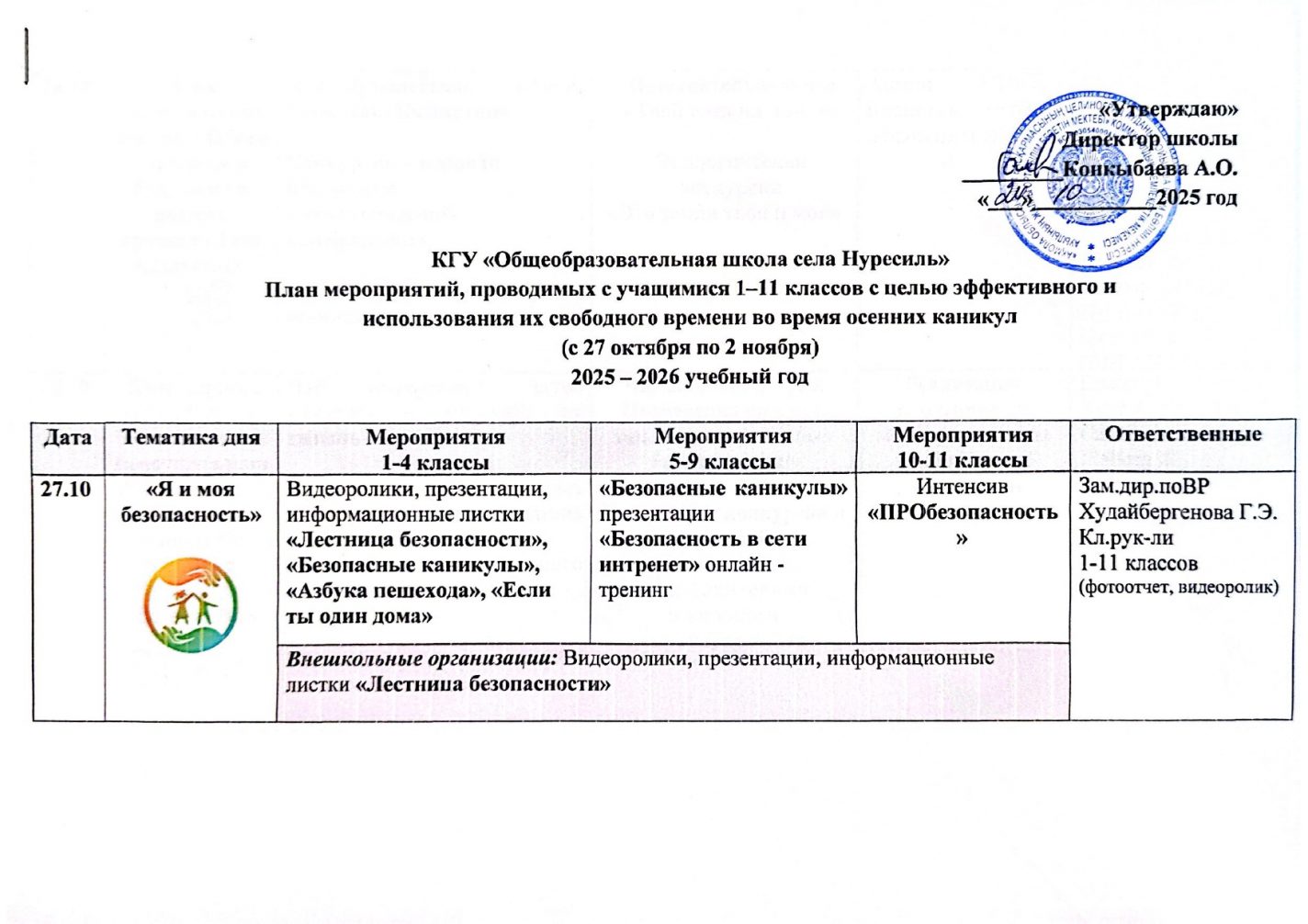 План мероприятий, проводимых с учащимися 1-11 классов с целью эффективного и использования их свободного времени во время осенних каникул (с 27 октября по 2 ноября) 2025-2026 учебный год